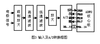 檢測輸入模塊包括差分測量放大器、低通和高通濾波器、增益放大器以及A/D轉(zhuǎn)換電路,如圖3所示。