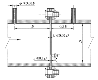 在管道里插入1個與管軸垂直的金屬板,金屬板中心為1個圓孔,孔的中心位于管道的中心線上,孔板稱為節(jié)流元件。在孔板進(jìn)氣側(cè)距離孔板1個管道直徑的位置,安裝1個測壓管;在孔板出氣側(cè)距離孔板半個直徑的位置,安裝1個測壓管。通過測壓管測出管道內(nèi)氣體的2個壓力,2個壓力之差代入公式就可以計算出流量。如圖1。