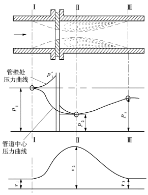 流體在管道截面I-I以前,以一定的速度流動,管內(nèi)靜壓力為p1。由于節(jié)流元件的孔徑小于管道內(nèi)徑,當(dāng)流體流經(jīng)節(jié)流元件時,流體截面突然收縮,流速加快,靜壓降低。當(dāng)流體流過圓孔以后,由于慣性作用,流體截面繼續(xù)收縮一定距離,到流體截面最小處,流體截面最小處(圖2中Ⅱ-Ⅱ)稱為縮脈,流體在縮脈處的流速最高,動能最大,靜壓最低。流體流過縮脈后,流體截面開始逐漸擴(kuò)大,到管道截面Ⅲ-Ⅲ處,流體截面恢復(fù)到整個管道截面。