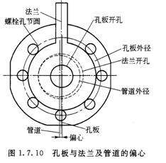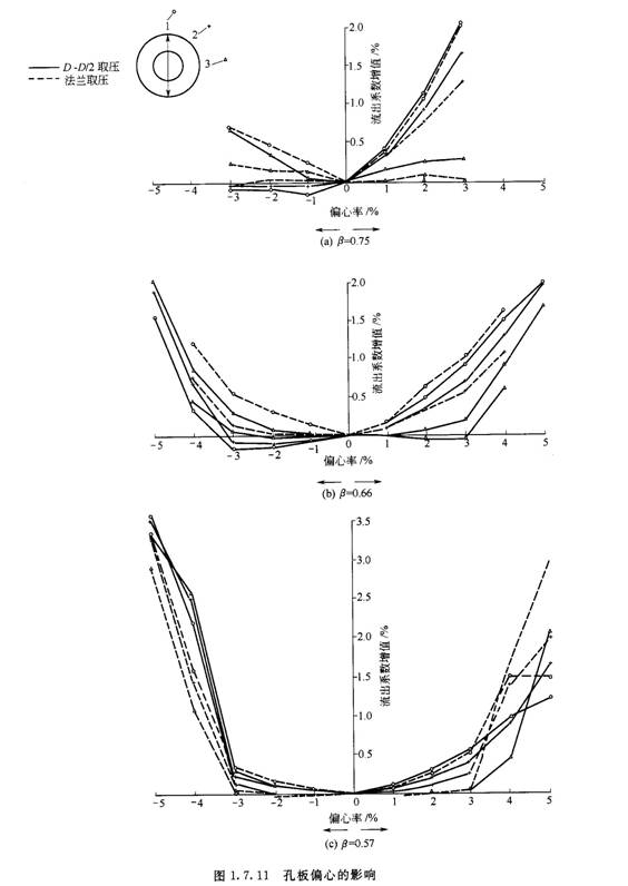 圖1.7.10所示為節(jié)流開孔軸線與法蘭內(nèi)圓軸線及管道軸線之間的偏心圖形。偏心率對流出系數(shù)的影響與B值、取壓方式、偏心方向等有關,如圖1.7.11所示。 自