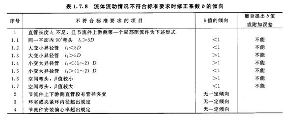 當節(jié)流件上游側(cè)直管段長度不符標準規(guī)定時,流出系數(shù)將發(fā)生變化。表1.7.6及表1.7.7列舉若干流出系數(shù)偏差的估算值及其附加不確定度。