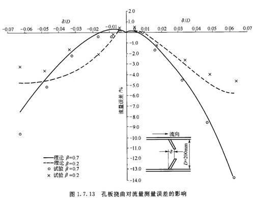 圖1.7.13所示為孔板撓曲對流量測量誤差的影響。造成孔板撓曲的原因可能有制造質(zhì)量差,安裝產(chǎn)生應力或大差壓造成的等等。