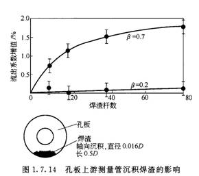 圖1.7.14和圖1.7.15所示為孔板上游側(cè)測量管底部沉積臟物對流出系數(shù)的影響。