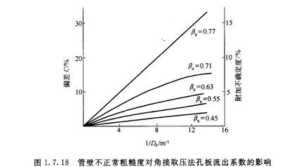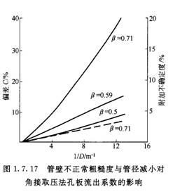 1.角接取壓標準孔板在糙管中流出系數(shù)的變化圖1.7.17和圖1.7.18所示為角接取壓標準孔板在糙管中流出系數(shù)的變化。圖1.7.17所示管壁條件為:管壁結(jié)垢為球形瘤,平均尺寸為6.3mm,亦就是管道內(nèi)徑有效值減少約6.3mm。 因中虛線B=0.71是經(jīng)砂磨表面,顆粒約O.5~1.Omm。圖1.7.18所示的管壁條件顆粒尺寸約1mm多,即約為圖1.7.17所示的1/3。