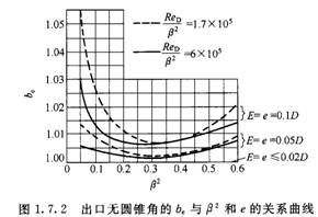 孔板開孔圓筒形部分長度e不論其出口是否有圃錐角,均應小于或等于0.02D.對角接取壓標準孔板,當e>0.02D時,應進行修正,其修正系數(shù)為be.be與ReD無關,僅與e和B2有關。但是,出口有圓錐角的孔板和無圓錐角的孔板,其be值是不同的,如圖1.7.2和圖1.7.3所示。這兩張圖可采用線性內(nèi)插,但不得外推。