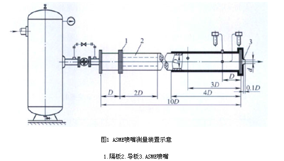 常用的節(jié)流測量裝置有:ASME噴嘴測量裝置、ISA1932噴嘴測量裝置、孔板測量裝置和文丘里噴嘴測量裝置。其中ASME噴嘴和ISA1932噴嘴測量裝置的氣體流出系數(shù)值較大,精度也較高,使用也較多。ASME噴嘴測量裝置由于氣體通常直接排空,且要求測量噴嘴壓差的壓差計量程較小,因此測量大流量時,該裝置的尺寸也比較大,不便于移動測量,如圖1所示。