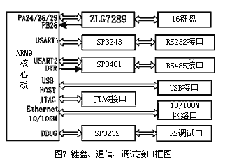 電磁流量計的鍵盤、通信和調(diào)試部分電路屬于嵌入式系統(tǒng)的典型應(yīng)用電路,系統(tǒng)利用ZLG7289A構(gòu)建了8X2小型鍵盤,由I/O模擬串行口建立系統(tǒng)連接,實現(xiàn)流量計的系統(tǒng)設(shè)置和按鍵數(shù)據(jù)輸入。