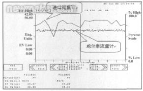本文所提的解決方案先后成功應(yīng)用于國內(nèi)兩家煤化工企業(yè)。首先,該方案被應(yīng)用于波動相對頻繁的豎管,橫管仍然采用原來的進口流量計。某企業(yè)因原進口流量計波動頻繁而引發(fā)跳車事故一年多達幾十次。由于威爾泰所提供的煤漿流量計平穩(wěn)性遠優(yōu)于其他同類產(chǎn)品,自投運以來,該企業(yè)從未因流量計波動而引起誤跳車。圖5所示為監(jiān)控系統(tǒng)工作站屏幕截圖所得的流量輸出平穩(wěn)性對比圖。由圖5可以看出,當位于橫管的進口流量計出現(xiàn)大幅度波動時,豎管威爾泰流量計輸出仍然保持平穩(wěn)。同時,工藝人員利用爐溫等其他參數(shù)進行綜合判斷,同樣證明了該豎管流量計輸出的穩(wěn)定性。